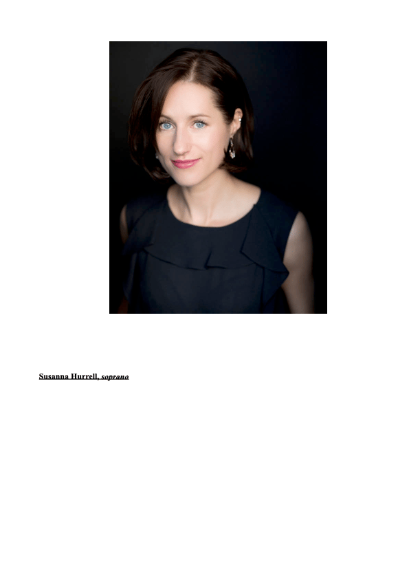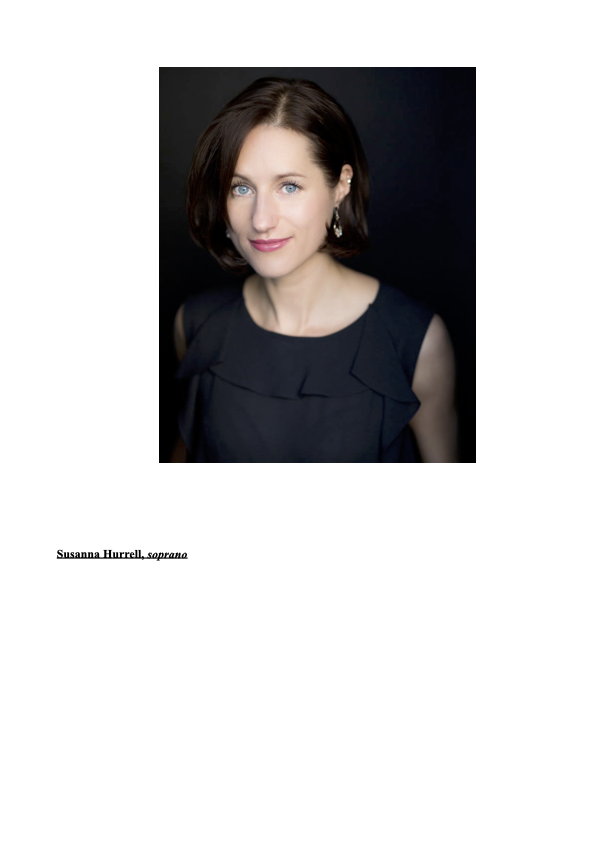 Susanna Hurrell, Sopran, wurde von der Kritik für ihre Auftritte am Royal Opera House, Covent Garden gelobt und sang für die English National Opera, die English Touring Opera, die Opéra de Lorraine, das Festival d'Aix en Provence, die Opéra de Limoges, das Landestheater Detmold, das Mariinsky Theater, die Norwegische Nationaloper, das Theater an der Wien und das Teatro del Liceu. Zu ihren Rollen gehören Lauretta, Melisande, Micaëla, Gretel, Susanna, Despina, Rosalinde, Opernrollen von Händel, Cavalli, Rossini und in Brittens The Turn of The Screw, Weills Street Scene, G. Benjamins Lessons in Love and Violence und P. Venables' 4.48 Psychosis. Sie hat mit dem BBC Symphony Orchestra, dem Royal Liverpool Philharmonic O., dem London Philharmonic O., dem Scottish Chamber O., dem English Chamber O. und dem Bournemouth Symphony O. gesungen. Sie war Finalistin beim Kathleen Ferrier Wettbewerb und Halbfinalistin beim Königin-Elisabeth-Wettbewerb in Brüssel. Sie studierte am Royal College of Music und am National Opera Studio, Großbritannien.