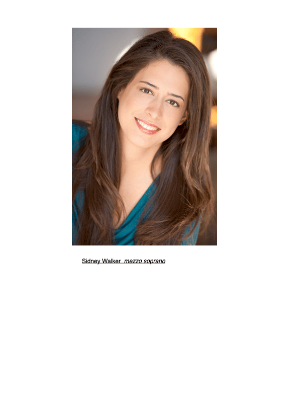 Die Mezzosopranistin Sidney Walker hat mit der Duluth Festival Opera, der Utah Festival Opera, International Opera Projects Berlin, Oper im Konzert Berlin und der Novefeltria in Italien in Rollen wie Dido (Dido und Aeneas), Cherubino (Le Nozze di Figaro), Dorabella (Cosi Fan Tutte), Carmen (Bizet/Brooks La Tragédie de Carmen), Orlofsky (Die Fledermaus), Hermia (Ein Sommernachtstraum), Fuchs (Das schlaue Füchslein), Hänsel (Hänsel und Gretel), Komponist (Ariadne auf Naxos) und Isabella (L’Italiana in Algeri). Zu ihren zeitgenössischen Opernrollen zählen Parables von Robert Aldrige und Hannah in Laura Kaminskys As One (Europapremiere).